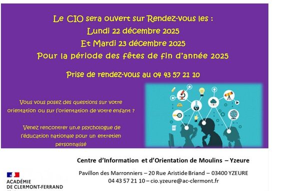 Le centre d'Orientation est d'Information sera ouvert le lundi 22 et mardi 23 décembre 2025