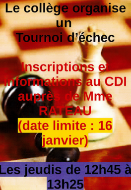 Le collège organise un tournoi d'échec : inscriptions d'informations au CDI auprès de Madame Rateau